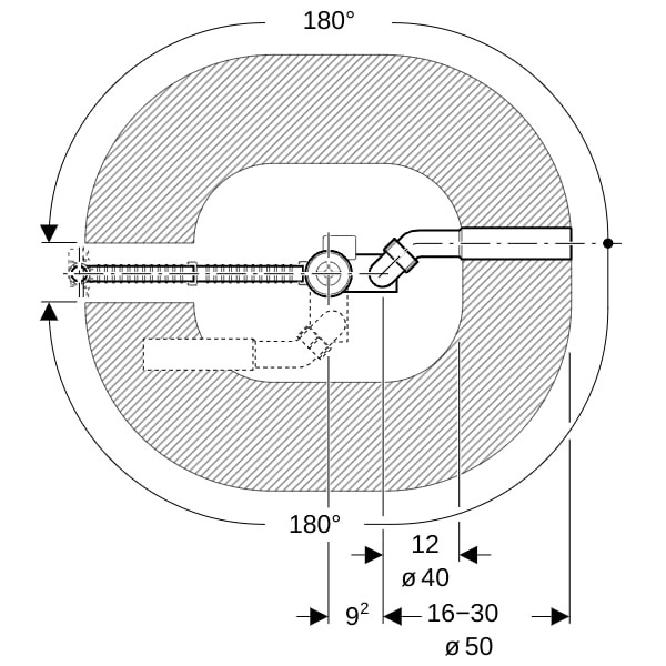 DN 40, für Badewannen mit Ventilloch Ø 52 mm, aus Stahl, Kunststoff oder Guss, in Spezialgröße, Güteüberwacht nach EN 274-3, mit Überlauf und Zulauf, Überlaufkopf ausgerichtet befestigbar, doppelseitige Dichtungen an Ab- und Überlauf, Einlaufstrahl ausrichtbar, mit Überlaufkopf mit Zulauf, Ablaufventil, Geruchsverschluss, Anschlusswinkel 90° mit MasterFix, 1/2“, radial dichtend, Anschlussbogen aus PE-HD, Ø 40/50 mm, Bauschutz und Befestigungsmaterial