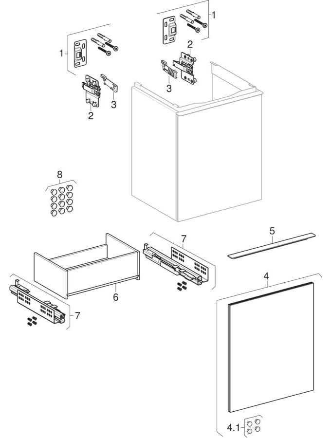 wandhängend, Schublade mit Selbsteinzug, Schublade ohne Geruchsverschlussausschnitt, Griff zum Öffnen (austauschbar), feuchtigkeitsbeständig, vormontiert gelierfert, bestehend aus Unterschrank für Handwaschbecken und Befestigungsmaterial