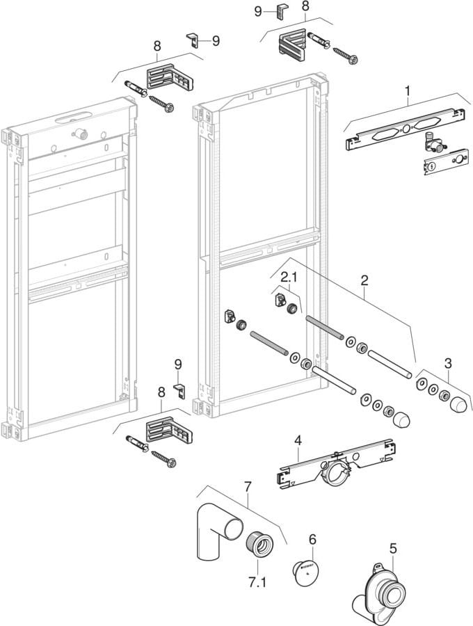 für gemauerte Wände, zum Einbau in teil- oder raumhohe Vorwandinstallationen, zur Montage von Urinalen mit integrierter Steuerung, zur Montage von wasserlosen Urinalen, für Geberit Urinale Preda, für Geberit Urinale Selva, für AP-Druckspüler, Montagerahmen verzinkt, Montagerahmen mit vier Befestigungswinkeln, Montagetiefe verstellbar, 8–12,5 cm, Montagetiefe ohne Befestigungswinkel 7,5 cm, Elementhöhe auf Urinal anpassbar, 109–127 cm, Anschlusspositionen für Geberit Urinal Preda eingestellt, Wasseranschluss MasterFix- und Mepla-Fix-fähig, Anschlusswinkel werkzeuglos montierbar, Befestigung für Einlauf Rp 1/2“ höhen- und seitenverstellbar, Befestigung für Anschlussbogen höhenverstellbar und schallgedämmt, Urinalbefestigungen M8, breiten- und höhenverstellbar, Traversen mit Mittenmarkierung, werkzeuglos verstellbar, Markierungen der Anschlusspositionen für Geberit Urinal Preda und Selva, Abdichtscheibe selbstklebend, vliesbeschichtet, zusätzliche Befestigung für Urinal mit Zubehör möglich, Schutzstopfen für einmalige Druckprüfung mit Kaltwasser bis maximal 15 bar/1500 kPa, bestehend aus Wasseranschluss R 1/2, Abdichtscheibe, Anschlussset für Urinal, mit Geruchsverschluss, Anschlussbogen aus PE-HD, ø 50/63 mm, Dichtung ø 57/50 mm, 2 Schutzstopfen, 2 Gewindestangen M8, Befestigungsmaterial