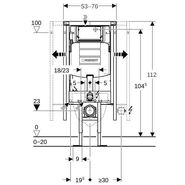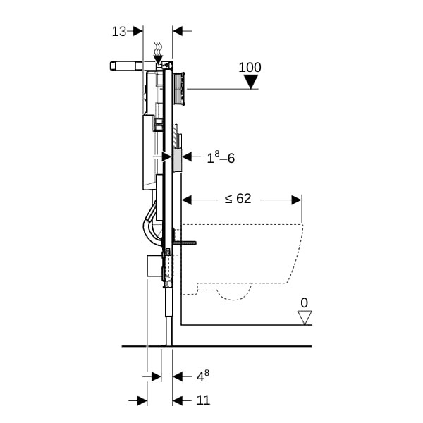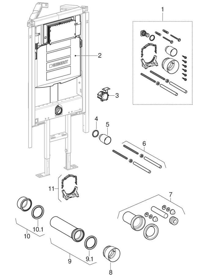 für Trockenbau, zum Einbau in teil-/raumhohe Vorwandinstallationen, zur frei stehenden Montage mit einseitigem Wandanschluss, für Wand-WCs mit Anschlussmaßen nach DIN EN 33:2011-11, mit Ausladung bis 62 cm, für 1-Mengen-, 2-Mengen- oder Spül-Stopp-Spülung, für Fußbodenaufbauten 0-20 cm, selbsttragender Rahmen pulverbeschichtet, Wandbefestigung variabel 30°- 60°, beidseitig 10 cm ausziehbar, integrierte Beplankungsauflage vorne, oben und seitlich ausziehbar, Mindest- und Maximalmaße für Grundfläche: B= 56/76 cm, T= 28/38 cm, Schenkellänge= 39,6/53,7 cm, Rahmen geeignet für WC-Keramiken mit kleiner Auflagefläche, Fußstützen verzinkt-verstellbar 0-20 cm, Fußstützen eingerückt für seitlichen Verzug der Abwasserleitung, Anschlussstutzen werkzeuglos montierbar, Befestigung Anschlussstutzen schallgedämmt, UP-Spülkästen mit Betätigung von vorne, schwitzwassergedämmt, bei Werkseinstellung sofortiges Nachspülen möglich, Montage-/Instandhaltungsarbeiten am UP-Spülkasten werkzeuglos, Wasseranschluss hinten oder oben Mitte, Bauschutz für Serviceöffnung schützt vor Feuchtigkeit, Schmutz und ist ablängbar, ausgerüstet mit Leerrohr für Wasserzuleitung zum Anschluss von AquaClean Dusch-WCs, mit Befestigungsmöglichkeit für Elektroanschluss, Berechnungsdurchfluss 0,11 l/s, Mindestfließdruck 50 kPa, Fließdruck 10-1000 kPa, max. Betriebstemperatur Wasser 25 °C, Spülmenge Werkseinstellung 6 und 3 l, große Spülmenge Einstellbereich 4,5/6/7,5 l, kleine Spülmenge Einstellbereich 3-4 l, bestehend aus Wasseranschluss R 1/2, MeplaFix-fähig, mit integriertem Eckventil und Handrad, Bauschutz für Serviceöffnung, Anschlussset für WC-Ø 90 mm, Anschlussbogen 90° aus PE-HD-Ø 90 mm, Übergangsmuffe aus PE-HD-Ø 90/110 mm, 2x Schutzstopfen, 2x Gewindestangen M12 UP-Dose für Bohrloch Ø 68 mm und Befestigungsmaterial, Anbindung für einseitigen Wandanschluss
