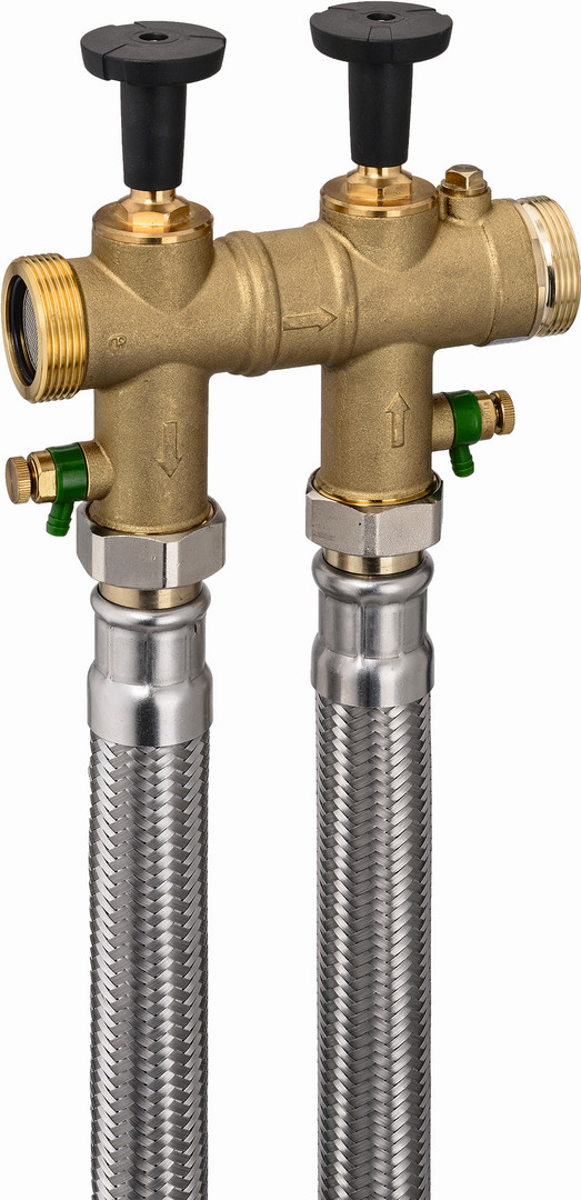 für Wasserenthärtungsanlagen, bestehend aus: Anschlussarmatur 1", 1 1/4", 1 1/2" mit Probeventilen, Einbaulänge 190 mm ohne Verschraubung, Einlaufsieb und Rückflussverhinderer im Wasserzulauf, Absperrventile Anlagenzulauf/Anlagenablauf, integriertes Überströmventil für Notbetrieb/Spitzenabnahme, Wasserzählerverschraubungen mit Dichtungen, flexible Anschlussschläuche mit Übergangsfitting, Anschluss-Set 1"-I, 1 1/4"-I und 1 1/2"-I ohne Überströmventil