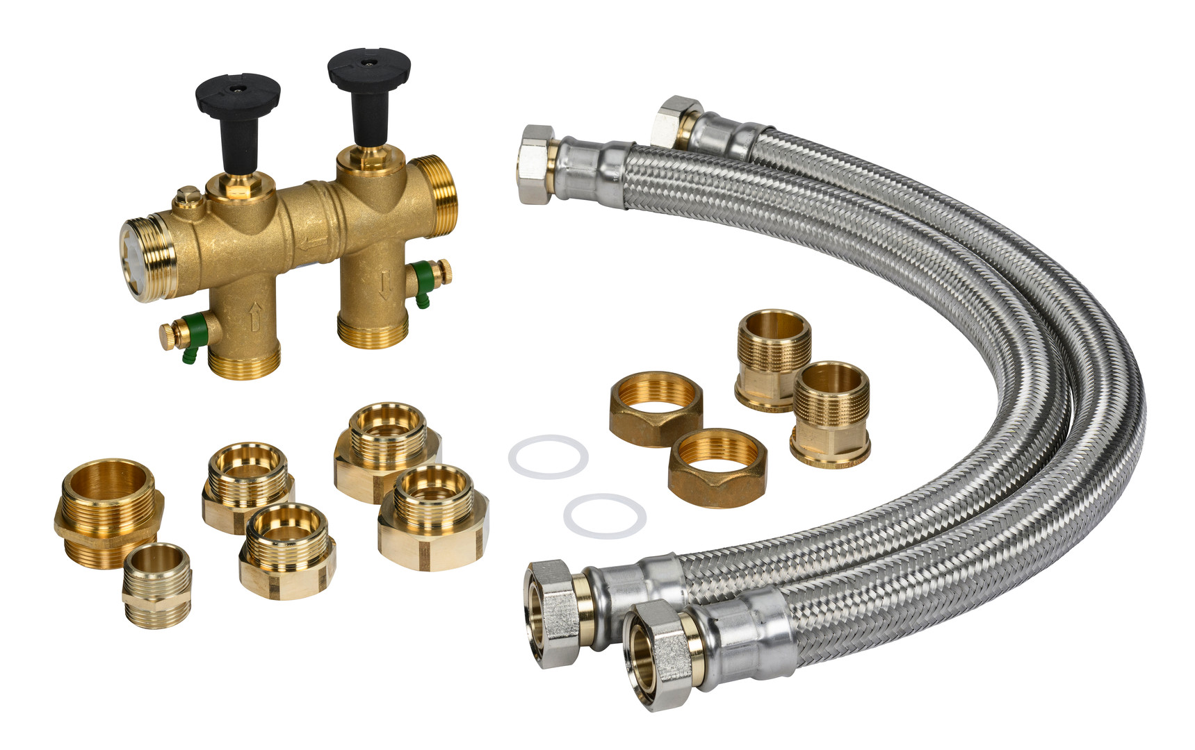 für Wasserenthärtungsanlagen, bestehend aus: Anschlussarmatur 1", 1 1/4", 1 1/2" mit Probeventilen, Einbaulänge 190 mm ohne Verschraubung, Einlaufsieb und Rückflussverhinderer im Wasserzulauf, Absperrventile Anlagenzulauf/Anlagenablauf, integriertes Überströmventil für Notbetrieb/Spitzenabnahme, Wasserzählerverschraubungen mit Dichtungen, flexible Anschlussschläuche mit Übergangsfitting, Anschluss-Set 1"-I, 1 1/4"-I und 1 1/2"-I ohne Überströmventil