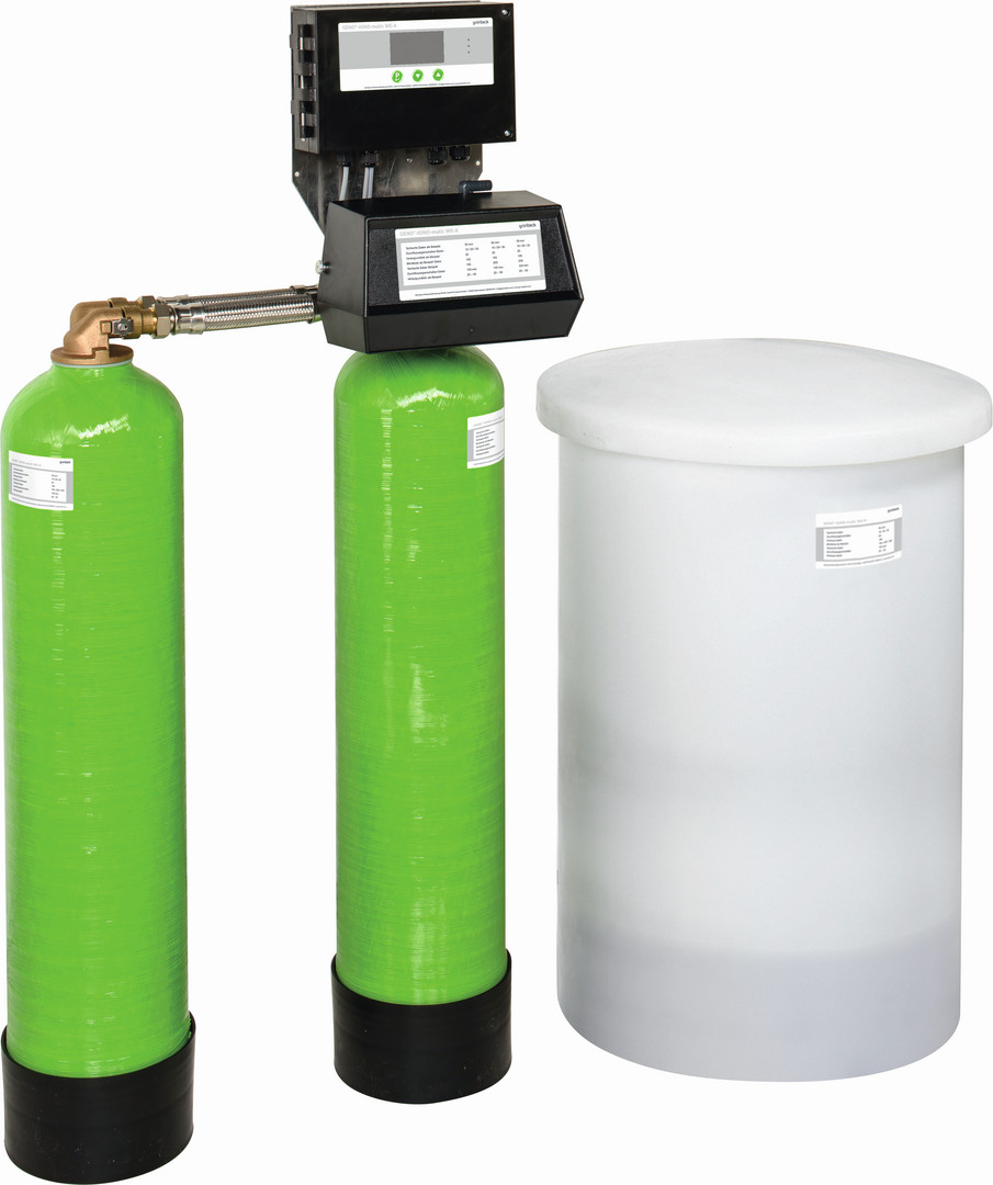 Sparbesalzung, vollautomatische Doppel-Enthärtungsanlage nach dem Ionenaustauschverfahren arbeitend, zur Erzeugung von vollenthärtetem Wasser mit mengengesteuerter Regeneration, Salzvorratsbehälter aus PE mit Deckel und Siebboden, Spezial-Soleventil mit Verbindungsleitung (ermöglicht max. Dauerdurchfluss), Austauscher Flasche aus Kunststoff mit Füllung Ionenaustauscherharz und Verteilersystem, ein Zentralsteuerventil aus Rotguss, Mikroprozessorsteuerung mit 3-Tasten-Bedienung mit potentialfreiem Melde-/Störmeldekontakt sowie programmierbarem Eingang, Steuerung mit LC-Grafikdisplay (hintergrundbeleuchtet), integrierte SD-Karte zur Erfassung der Betriebsdaten, Kontaktwasserzähler mit Wasserzählerverschraubungen