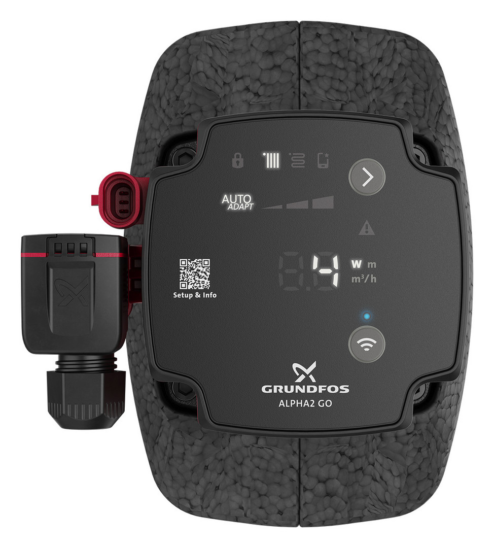 für Heizungs- und Klimaanlagen, über integrierte Bluetooth-Schnittstelle lässt sich eine Verbindung zur App Grundfos GO herstellen, Anschluss Zulauf G, Betriebsdruck max. 10 bar, Versorgungsspannung 1 x 230 V +- 10 %, 50/60 Hz, PE, Schutzart IPX4D, Pumpengehäuse Grauguss, mit Alpha-Kabelklemmstecker, Wärmedämmschale und Dichtungen (ohne Verschraubungssatz)