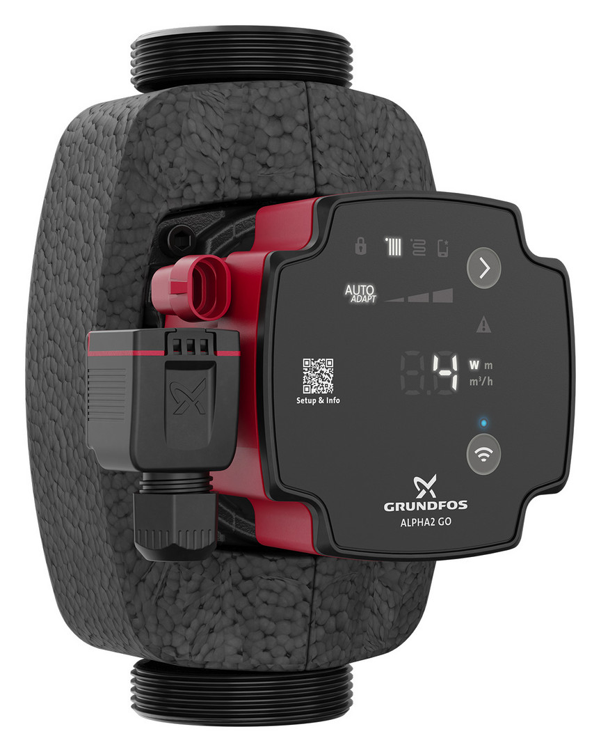 für Heizungs- und Klimaanlagen, über integrierte Bluetooth-Schnittstelle lässt sich eine Verbindung zur App Grundfos GO herstellen, Anschluss Zulauf G, Betriebsdruck max. 10 bar, Versorgungsspannung 1 x 230 V +- 10 %, 50/60 Hz, PE, Schutzart IPX4D, Pumpengehäuse Grauguss, mit Alpha-Kabelklemmstecker, Wärmedämmschale und Dichtungen (ohne Verschraubungssatz)