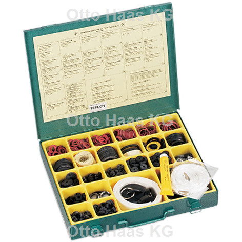Box mit Tragegriff, aus grünem einbrennlackierten Stahlblech hergestellt mit 2 Spannverschlüssen, bestehend aus: 100x Fiberringe für Trinkwasser "W 270" und "UBA" 3/8" 9 x 14 mm, 5x Fiberringe für Trinkwasser "W 270" und "UBA" 3/4" 27 x 33 mm, 15x Gummidichtungen für Überwurfmuttern 1 1/4" 30 x 39 mm, 10x Gummidichtungen für Perlstahlregler 15 x 21 x 2 mm, 50x OHA-Qualitäts-Wasserhahnscheiben mit Loch 1/4" u. 3/8" 13 mm, 5x OHA-Qualitäts-Wasserhahnscheiben mit Loch 3/4" 24 mm, 30x Ventil-Dichtungen passend für GROHE-Longlife-Oberteil 1/2" 16,5 mm, 50x Gummi-Quetsch-Dichtungen für Niederdruckarmatur 3/8" 8 x 14 mm, 100x Fiberringe für Trinkwasser "W 270" und "UBA" 1/2" 10 x 18 mm, 15x OHA-Press-Tauchrohranschlussdichtung "W 270" und "UBA" 1 1/4" 30 x 39 mm, 10x Gummidichtungen für Perlstrahlregler 14 x 21 x 3 mm, 3x PE-Wassermesser-Dichtungen für Kaltwasserzähler 1" 29 x 37 x 2 mm, 50x OHA-Qualitäts-Wasserhahnscheiben mit Loch 3/8" 14 mm, 5x Kunststoff-Quetschring für Tauchrohre 11/2" 40,5 x 45 x 3 mm, 2x Schmutzsiebe aus Metall, 1x Kugelketten Messing verchromt, 300 mm lang, 1x Kugelketten Messing, verchromt 500 mm lang, 1x Perlstrahlregler verchromt, M22 Innengewinde, 1x Perlstrahlregler 1" M24 Außengewinde, 50x Gummi-Quetsch-Dichtungen 3/8" 10 x 14 mm, 5x Gummi-Tauchrohrdichtung 33 x 38 x 5 mm, 100x Fiberringe für Trinkwasser "W 270" und "UBA" 1/2" 12 x 19 mm, 10x Gummi-Dichtungen für Überwurfmuttern 11/2" 32 x 45 mm, 5x PE-Wassermesser-Dichtungen für Kaltwasserzähler "W 270" und "UBA"3/4" 23 x 29 x 2 mm, 50x OHA-Qualitäts-Wasserhahnscheiben mit Loch 3/8" u. 1/2" 15 mm, 1x Sanifreund Montagestreifen Länge 1 m, 1x Allgas-PTFE-Gewinde-Dichtband für Feingewinde "W 270" und "UBA", 1x Ventilstopfen mit großem Splintring Handring, 1x Ventilstopfen "Komfort" für Abläufe 40,5 mm, 1x Ventilstopfen "Komfort" für Abläufe 43,5 mm, 50x Fiberringe für Trinkwasser "W 270" und "UBA" 3/4" 16 x 24 x 2,5 mm, 10x OHA-Press-Tauchrohranschlussdichtung "W 270" und "UBA" 35 x 45 mm, 5x Gummi-Waschmaschinen-Anschlussdichtung 1/2" 12 x 23 x 2 mm, 3x Gummi-Tauchrohr-Dichtungen 11/2" 38 x 41,5 mm, 50x OHA-Qualitäts-Wasserhahnscheiben mit Loch 1/2" 16 mm, 50x Fiberringe für Trinkwasser "W270" und "UBA" 3/8" 17 x 21 mm, 5x Gummi-Tauchrohranschlussdichtung 1 1/4" 30 x 37 mm, 12x Gummi-Ringe für Schlauchverschraubungen mit Einlage 1/2" 15 x 24 x 3 mm, 5x Gummi-Ringe für Schlauchverschraubungen mit Einlage 3/4" 21 x 30 x 3 mm, 40x OHA-Qualitäts-Wasserhahnscheiben mit Loch 1/2" 17 mm, 2x Gummi-Membranen flach, für Spülkästen passend für Geberit 10200, 63 x 23 x 3 mm, 2x Gummi-Membranen flach, für Spülkästen passend für Geberit 10000, 63 x 32 x 3 mm, 2x Gummi-Membranen flach, für Spülkästen passend für Geberit 25920 und 25925, 58 x 32 x 3 mm, 2x Gummi-Membranen flach, für Spülkästen passend für DAL, 29 x 65 x 3 mm, 2x Gummi-Membranen flach, für Spülkästen passend für Schwab, 24 x 64 x 4 mm, 2x Gummi-Membranen flach, für Spülkästen passend für ABU-STAR, 31 x 62 x 2,2 mm, 1x OHA-Armaturen-Hahnfett Tube 25 ml, 1x Ventilstopfen "Komfort" für Abläufe 45,5 mm, 1x Ventilstopfen "Komfort" für Abläufe 38,5 mm, 1x OHA-Glasfaser-Bänder und Rundschnüre 6 x 1000 mm, 50x Fiberringe für Trinkwasser "W 270" und "UBA" 1/2" 21 x 25 mm, 7x Keildichtung für Waschtischsiphon passend zu Grohe-Siphon 1 1/4", 3x Keildichtung für Spülensiphon 11/2" 40 x 8 mm, 30x OHA-Qualitäts-Wasserhahn-Vollscheiben 1/2" 16 mm
