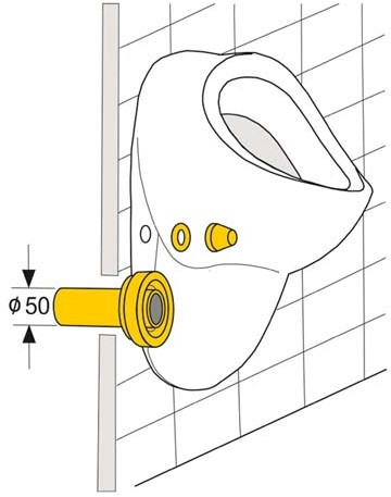 mit 2 chromfarbigen Abdeckkappen und 2 Exzenterscheiben, für Urinal mit Ablaufstutzen Ø 65 mm außen, Anschlussrohr Ø 50 mm, mit Gummi-Spezialdichtung, Set im Polybeutel verpackt