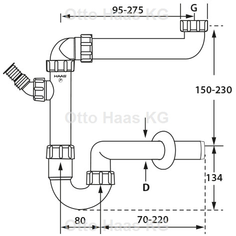 mit höhenverstellbarem Tauchrohr, mit einem Kombi-Geräteanschluss 3/4" und 1", komplett mit allen Dichtungen und Rosette und Verschlussstopfen, einzeln im Polybeutel verpackt, nach DIN EN 274