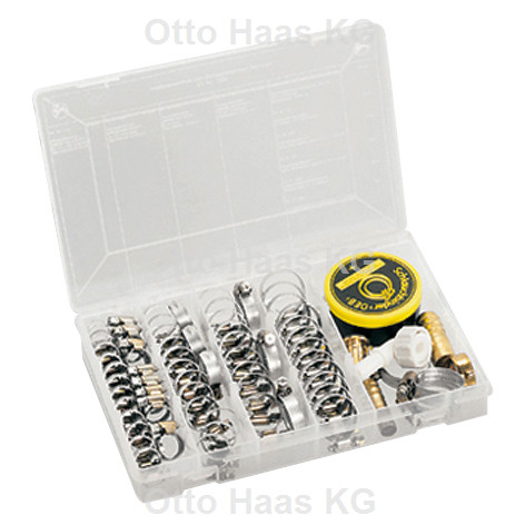 bestehend aus: 20 Schlauchklemmen nach DIN 3017-1 1/4" + 3/8", 9 mm breit/Spannbereich 10-16 mm, 15 Schlauchklemmen nach DIN 3017-1 1/2", 9mm breit/Spannbereich 12-22 mm, 15 Schlauchklemmen nach DIN 3017-1 9 mm breit/Spannbereich 16-27 mm, 12 Schlauchklemmen nach DIN 3017-1 3/4", 9mm breit/Spannbereich 20-32 mm, 3 Schlauchklemmen nach DIN 3017-1 1", 13 mm breit/Spannbereich 25-40 mm, 1 Endlosschlauklemme, 1 Verbindungsröhrchen Messing gepresst, 1/2"-Schlauch, 1 Verbindungsröhrchen Messing gepresst, 3/4"-Schlauch, 1 Schlauchverschraubungen Messing poliert, 1/2"-Schlauch, 1 Winkelverschraubung 90° aus Kunststoff für 1/2"-Schlauch