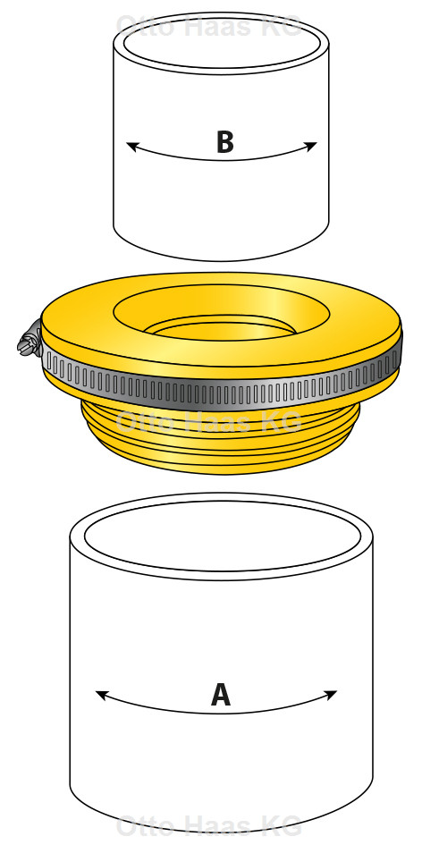 innenliegender Adapter, zur Verbindung und Reduzierung von Abwasserrohren mit unterschiedlichen Außen- bzw. Innenrohrdurchmessern, für waagerechten wie senkrechten Einbau geeignet, passend für Faserzement-/Eternitrohr/Geberit PE/Geberit Silent-db 20/Geberit Silent-PP/Gusseisenrohr GGG duktil/HT-Rohr/KG-Rohr/LNA Gusseisenrohr/LORO-X/POLO-KAL NG/Skolan db/SML/MLB/Steinzeugrohr Harsch und Wavin AS, druckdicht bis 0,5 bar, UV-beständig, CE-konform, EPDM alterungs- und witterungsbeständig nach DIN EN 681-1, mit Schlauchklemmen W2, Band und Gehäuse aus nichtrostendem Chromstahl 1.l4016 X6Cr17 nach DIN 3017-1, SW 7, Außensechskantschraube W1, Inhalt: 1x DN 50/DN 32, 1x DN 50/DN 40, 1x DN 75/DN 40-50, 1x DN 100/DN 50, 1x DN 100/DN 75, 1x DN 125/DN 75, 1x DN 125/DN 90, 1x DN 150/DN 100, 1x DN 150/DN 125