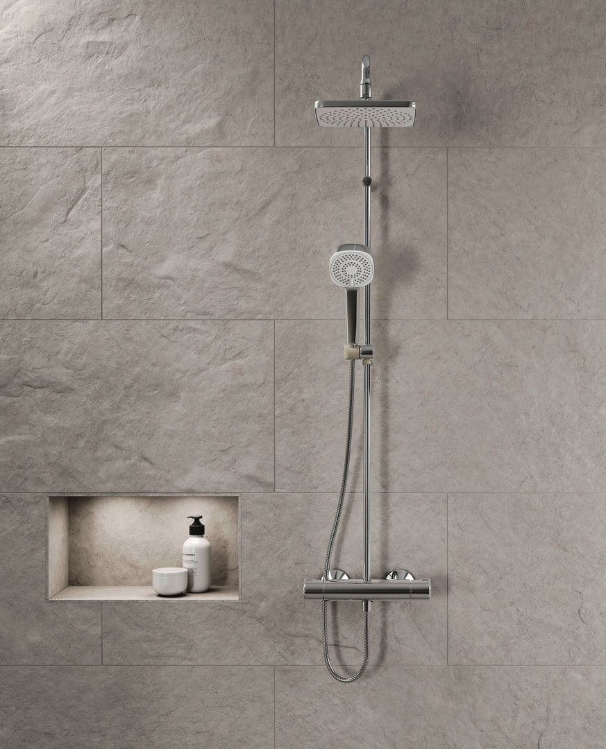 DN 15, Heißwasserversorgung max. 65°C, Arbeitsdruck 1-10 bar, Durchfluss bei 3 bar 18 / 15,6 l/min, Anschlussgröße G1/2, Kopfbrausengröße 200 x 200 mm, Handbrausengröße Ø 95 mm, Ausladung 445-470 mm, Installationsabstand 150 ± 3 mm, Sicherungseinrichtung (EN1717) EB, Geräuschklasse I (ISO 3822), Material Messing, Handbrause, Brausestange, Kopfbrause, verstellbare Brausestangehalterung, Brauseschlauch (1750 mm), Eco-Durchfuss, variable Montagemöglichkeit, schwenkbares Kugelgelenk, Anti-Kalk-Technik, S-Anschlüsse, Außengewinde, Abdeckung(en), Schalldämpfer, Oberteil mit keramischen Dichtscheiben zur Wassermengeneinstellung für einen Abgang, Thermostatkartusche zur Temperaturreglung, Rückfussverhinderer, Schmutzflter, Drehumsteller, druckunabhängig, integrierter Umsteller mit Absperrung, Sicherheitssperre gegen Verbrühen bei 38°C, mehr Sicherheit durch minimales Erwärmen des Armaturengehäuses, Temperatureinstellgriff, Durchfusseinstellgriff, Eco-Funktion für die Wassermenge, Sicherheitshebel, 3-strahlig, kürzbar