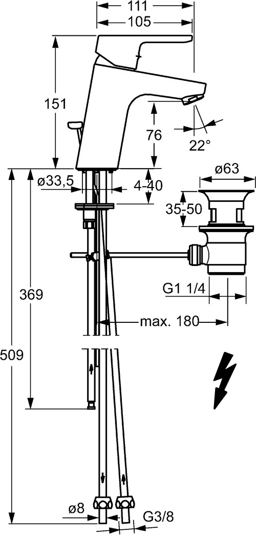 DN 15, Niederdruck, für offene Heißwasserbereiter, Heißwasserversorgung max. 80°C, Arbeitsdruck 0,5-5 bar, Anschlussgröße Ø 8 mm, Ausladung 111 mm, Sicherungseinrichtung (EN1717) AA, Material Messing, Ø 3,5 classic Steuerpatrone mit keramischen Dichtscheiben zur Wassermengen- und Temperatureinstellung, Ablaufgarnitur mit Zugstange, feststehender Auslauf, Temperaturbegrenzer, Heißwassersperre einstellbar (im Lieferumfang enthalten), Hebel mit W+K-Kennzeichnung, Einhandbedienhebel/Griff, Armaturenkörper aus entzinkungsbeständigem Messing (DZR), Rapid-Montagesystem, kristallklarer Laminarstrahl, Strahlregler, Anschluss über Kupferrohre