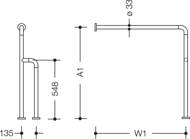 mit durchgehendem, korrosionsgeschütztem Stahlkern, links- und rechtsseitig montierbar, Befestigung an Wand und Boden mit Befestigungsmaterial, 135 mm tief, Stangen ø 33 mm, Rosetten ø 70 mm, aus Polyamid