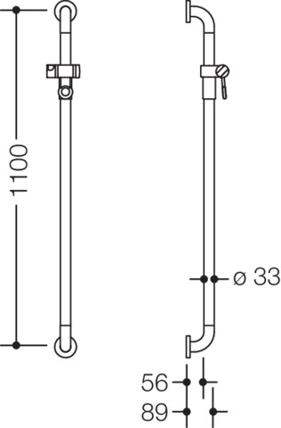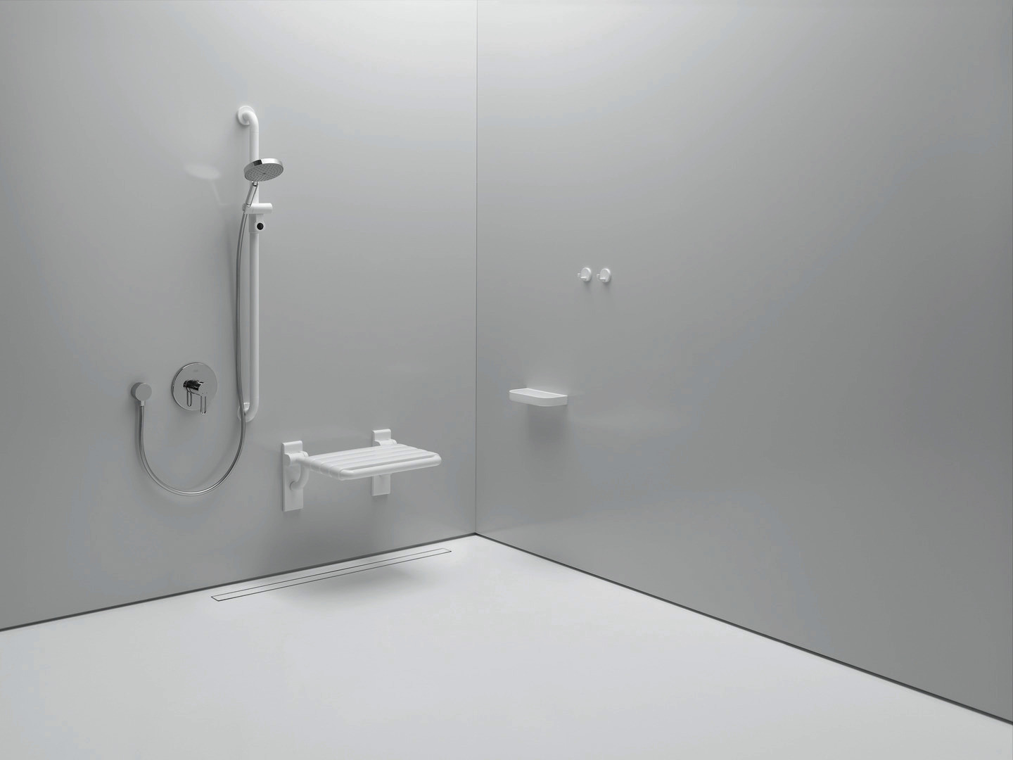 Brausehalter kann stufenlos geneigt und in der Höhe verstellt werden, konische Aufnahme am Brausehalter zum Einhängen der Handbrause, Montage an der Wand mit Befestigungsmaterial, 88 mm tief, Stange ø 33 mm, Rosetten ø 70 mm, aus Polyamid, mit durchgehendem, korrosionsgeschütztem Stahlkern und Stahl-Befestigungsrosetten