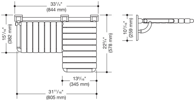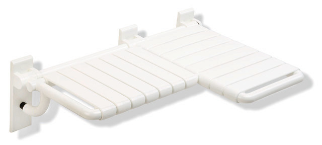 HEWI Duschklappsitz, L-förmig (ADA), Polyamid, hochglänzend, schmaler Sitzteil 460 mm breit und 382 mm tief, vorstehender Sitzteil 345 mm breit und 578 mm tief, vorstehender Sitzteil rechts, in HEWI Farbe 99 (Reinweiß)