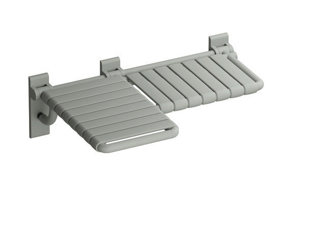 HEWI Duschklappsitz, L-förmig (ADA), Polyamid, matt, schmaler Sitzteil 460 mm breit und 382 mm tief, vorstehender Sitzteil 345 mm breit und 578 mm tief, vorstehender Sitzteil links, in HEWI Farbe 95 (Felsgrau)