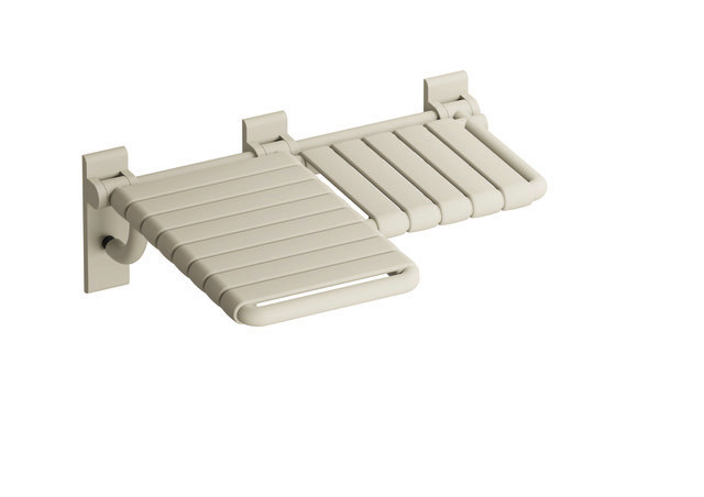 HEWI Duschklappsitz, L-förmig (ADA), Polyamid, matt, vorstehender Sitzteil 340 mm breit und 382 mm tief, L-Teil 345 mm breit und 578 mm tief, vorstehender Sitzteil links, in HEWI Farbe 99 (Reinweiß)