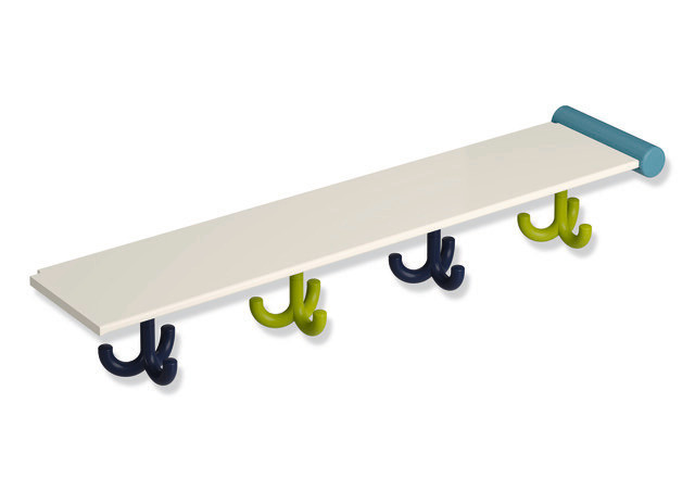 Halter und Haken aus Polyamid, Bestückung der farbigen Haken erfolgt aus Sichtrichtung des Nutzers von links nach rechts, Trägerplatte aus HPL, Oberfläche weiß, seidig glänzend mit leichter Struktur, Abstand zwischen den Plätzen von 150 mm, entspricht den Vorgaben der DGUV-Richtlinie 82 "Kindertageseinrichtungen", max. statische Belastung 20 kg, 630 (Achsmaß 600 mm) x 89 x 132 mm