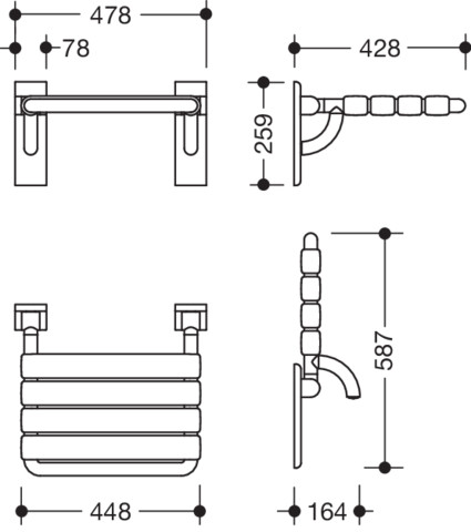 kann hochgeklappt werden, Neigung der Sitzfläche ist verstellbar, mit durchgehendem, korrosionsgeschütztem Stahlkern, Wandplatte aus Polyamid mit integriertem Stahlkern, verdecktes, korrosionsfreies und geprüftes Befestigungsmaterial für unterschiedliche Wandaufbauten (bitte separat bestellen), Sitzfläche 448 x 428 mm, belastbar bis max. 150 kg