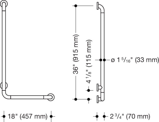 HEWI Winkelgriff (ADA), Polyamid, matt, waagerechte Länge 457 mm, senkrechte Länge 915 mm, Tiefe 70 mm, Stangendurchmesser 33 mm, links- und rechtsseitig montierbar, in HEWI Farbe 99 (Reinweiß)