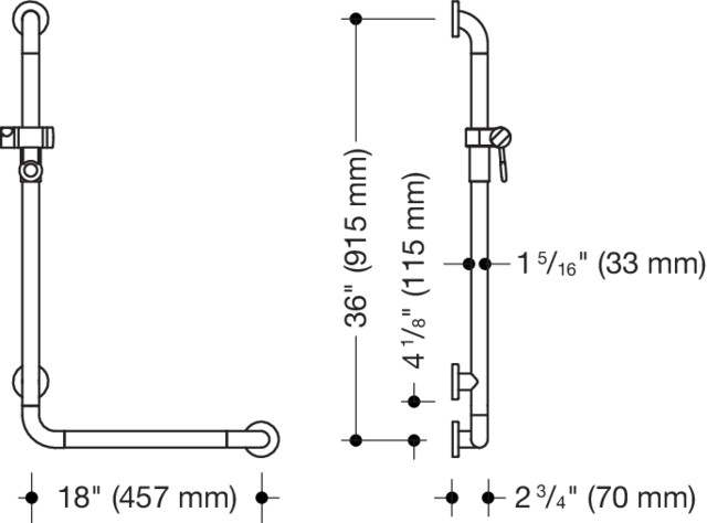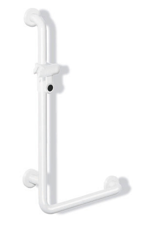HEWI Winkelgriff mit Brausehalter (ADA), Polyamid, hochglänzend, waagerechte Länge 457 mm, senkrechte Länge 915 mm, Tiefe 70 mm, Stangendurchmesser 33 mm, links- und rechtsseitig montierbar, in HEWI Farbe 92 (Anthrazitgrau)
