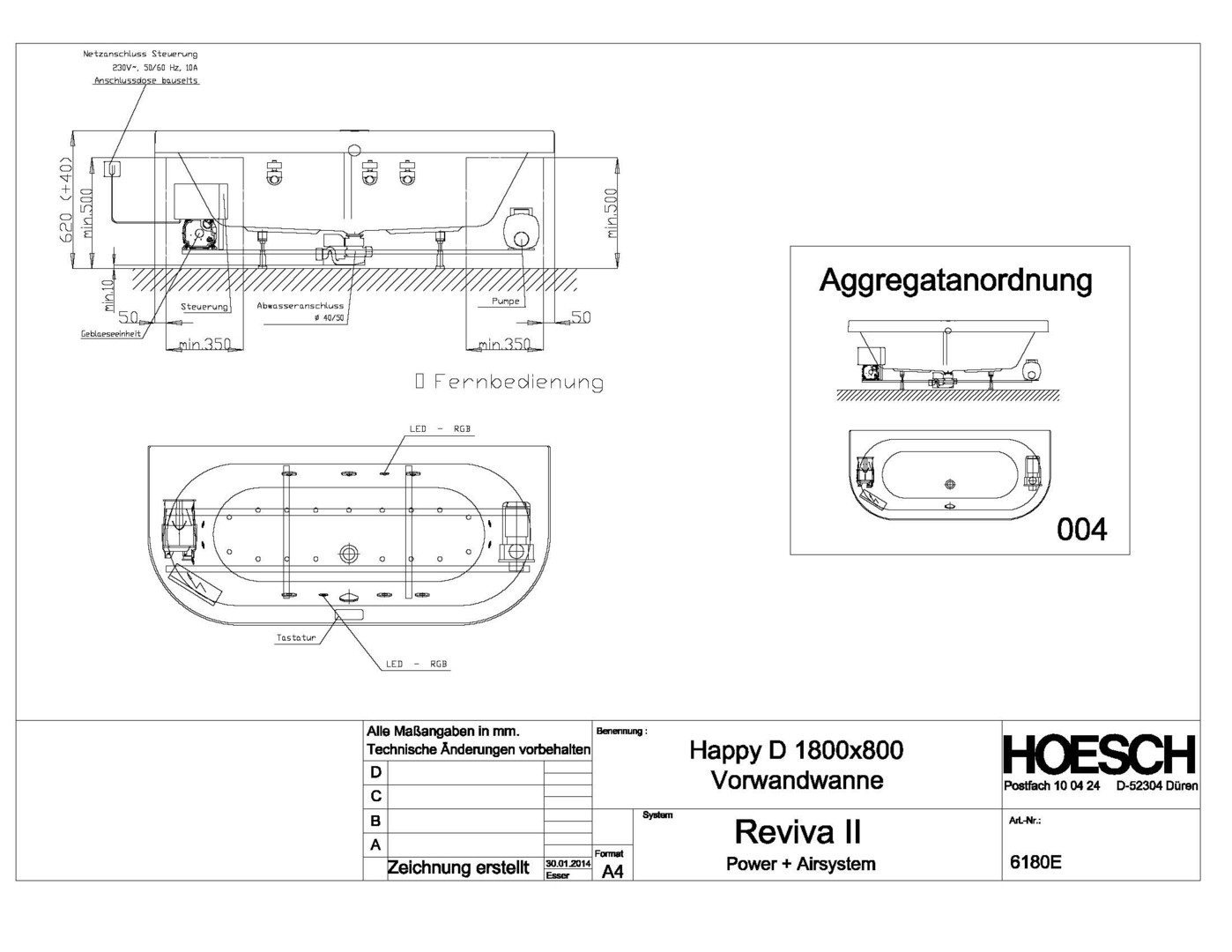 HO Whirlwanne Happy D. Vorwand 1800x800 mit System Reviva II Power+ Air,Weiß/Chrom/Motor rechts/links