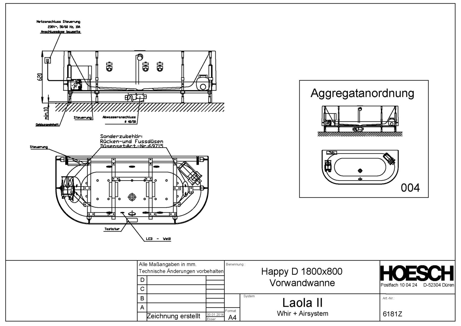 HO Whirlwanne Happy D. Vorwand 1816x808 mit angeformter Schürze mit System Laola II Whirl+ Air,Weiß/Chrom/Motor rechts/links
