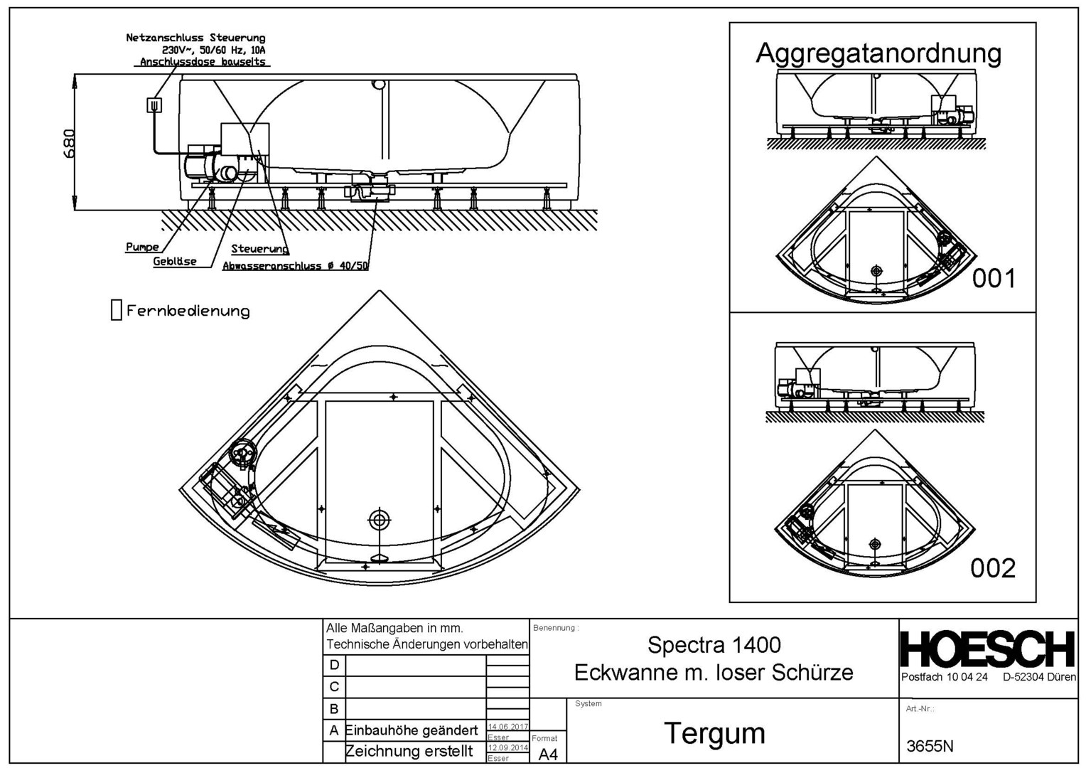 HO Whirlwanne Spectra Eck 1400 mit loser Schürze und Gestell mit System Tergum Whirl Weiß/Chrom/Motor links