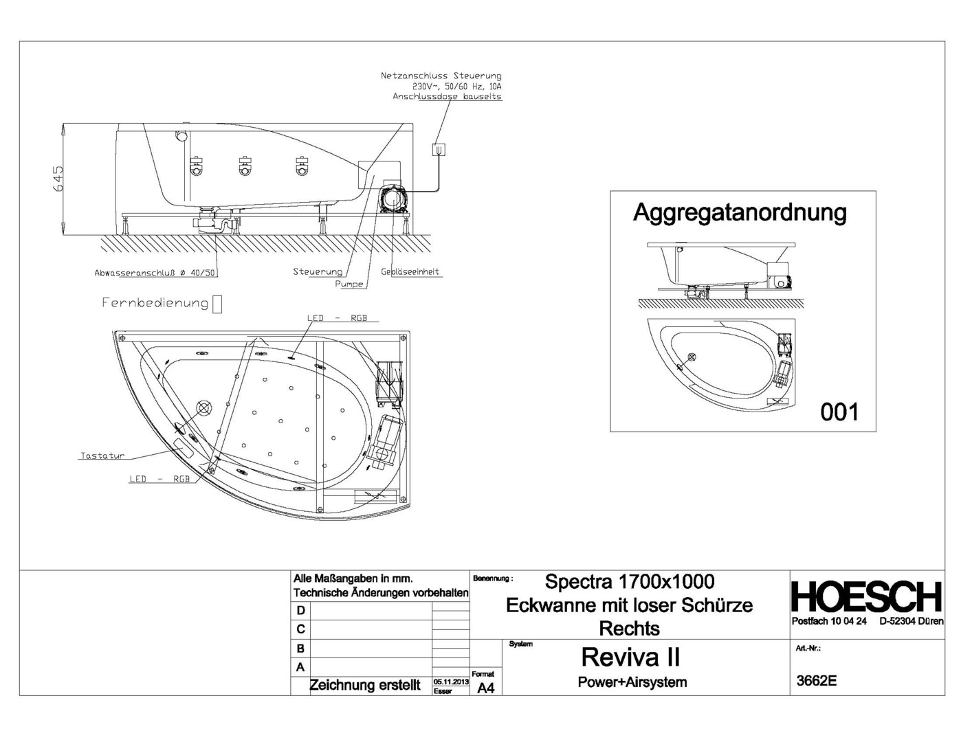 HO Whirlwanne Spectra Eck 1700x1000 rechts mit loser Schürze mit System Reviva II Power+ Air, Weiß/Chrom/Motor rechts