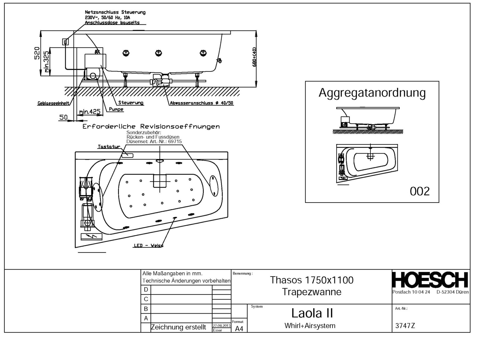 HO Whirlwanne Thasos Trapez 1750x1100 links mit System Laola II Whirl+Air Weiß/Chrom/Motor links