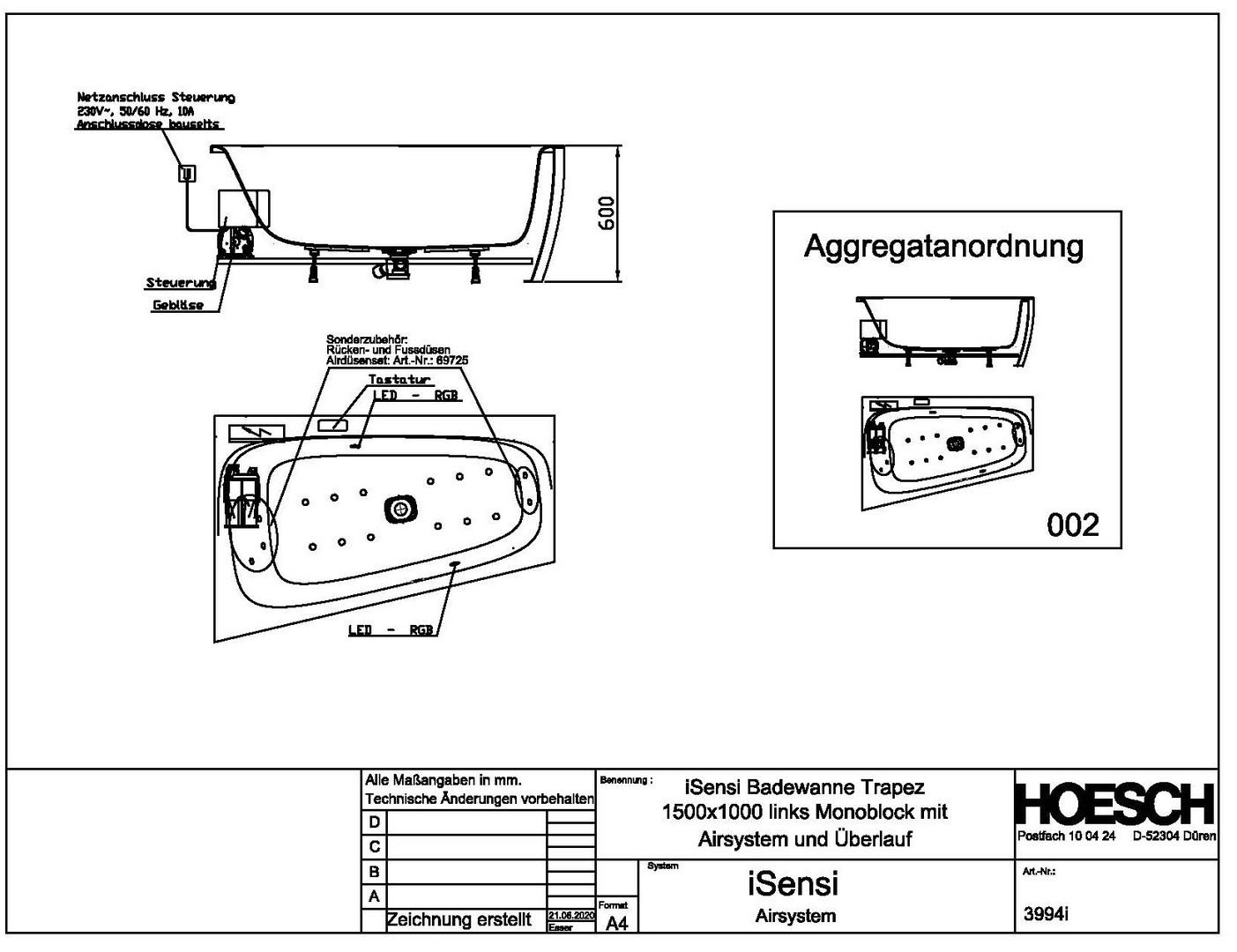 | Bedienung | Elektronisch auf dem Wannenrand |