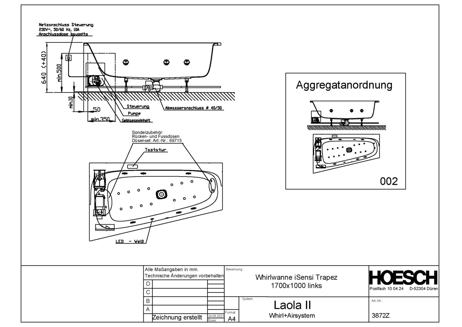 HO Whirlwanne iSensi Trapez 1700x1000 links mit System Laola II, weiß/verchromt/Motor links