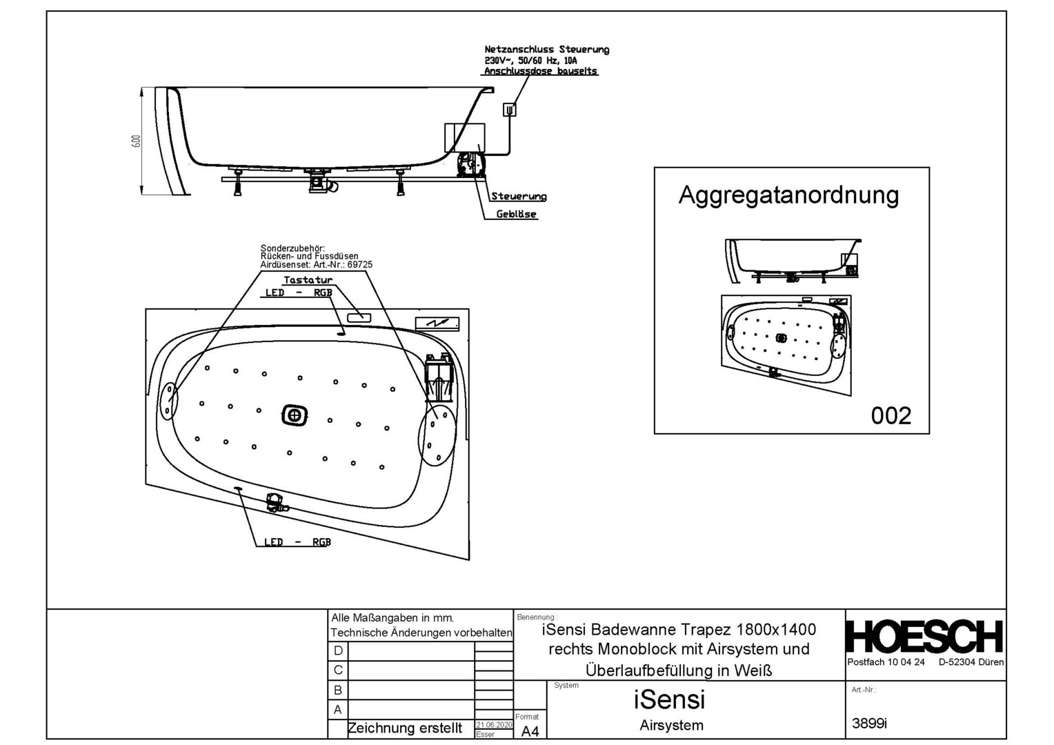 HO Whirlwanne iSensi Trapez 1800x1400 Monolith rechts mit Überlaufbefüllung Weiß, iSensi System Motor rechts