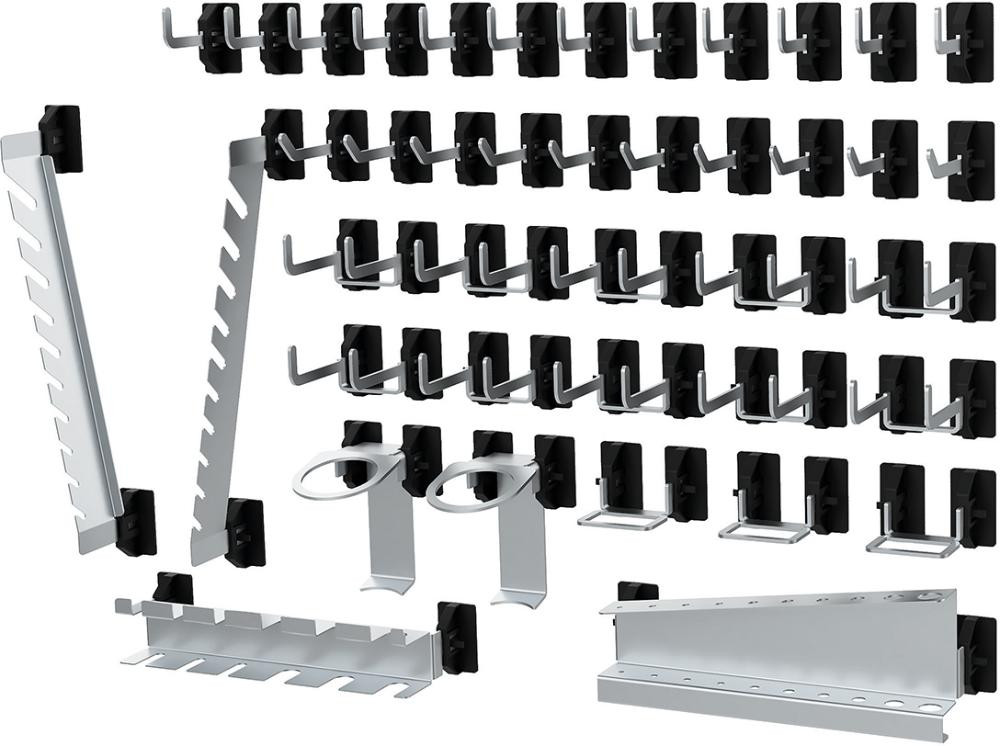 • Halter werden mithilfe von Kunststoffträgern einfach in die Rasterung der Lochwände eingesetzt