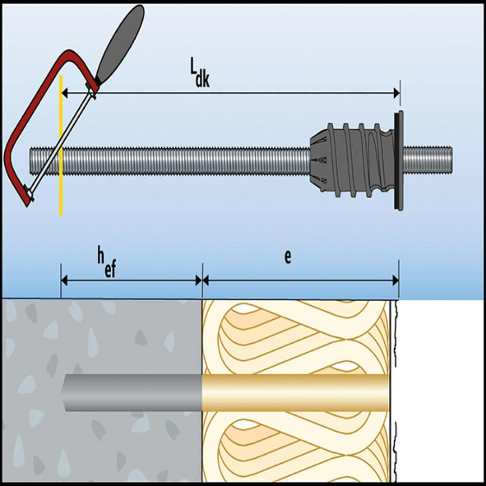 • Hohe Anwendungsflexibilität: Ein Set für alle Dämmstoffarten und -dicken von 60–300 mm in Beton und 60–250 mm in Lochsteinen (ResiTHERM® 16), von 60–220 mm in Beton und 60–160 mm in Lochsteinen (ResiTHERM® 12)