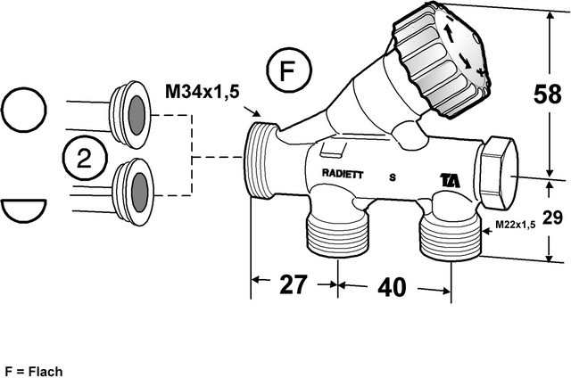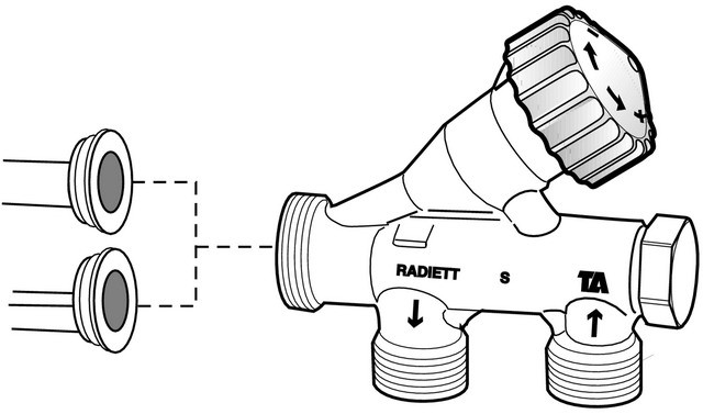 zum Regulieren und Regeln, zur Erreichung der gewünschten Raumtemperatur, Funktionen Regulieren, Voreinstellung, Absperren, Umstellbar für 1- oder 2-Rohr-Ausführung, PN 10, max. Differenzdruck 100 kPa= 1 bar, höchstzulässiger Druckverlust zur Vermeidung von Fließgeräuschen 30 kPa= 0.3 bar= 3 mWs (für sämtliche Ventile und Abmessungen), Temperatur max. Betriebstemperatur 120 °C, Ventilgehäuse Messing, Kegel Messing, Spindel im Oberteil PTFE-beschichtet, Oberflächenbehandlung: vernickelt, Kennzeichnung TA, RADIETT oder R-ETT und Durchflusspfeilen, Gewinde für Thermostatkopf M30 x 1,5, flach, wahlfreier Anschluss, Vor- und Rücklauf, 2 verschiedene Tauchhülsen werden mitgeliefert