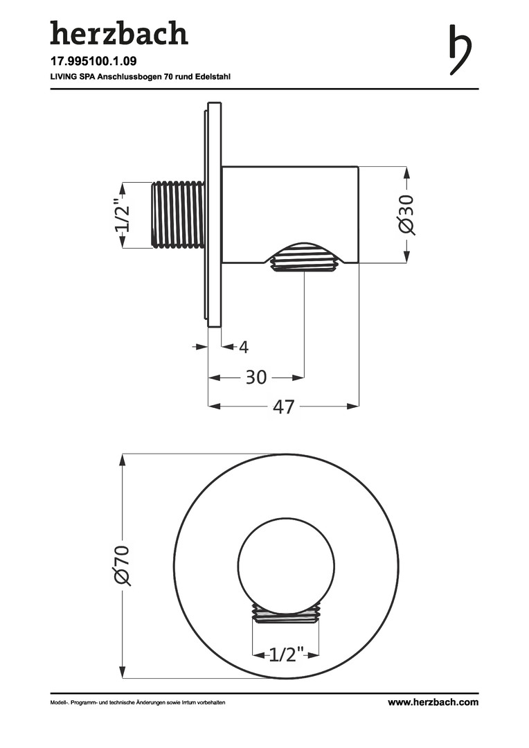 Herzbach Brauseanschlussbogen Living Spa seven round 1/2", Rosette d= 70mm, Edelstahl gebürstet