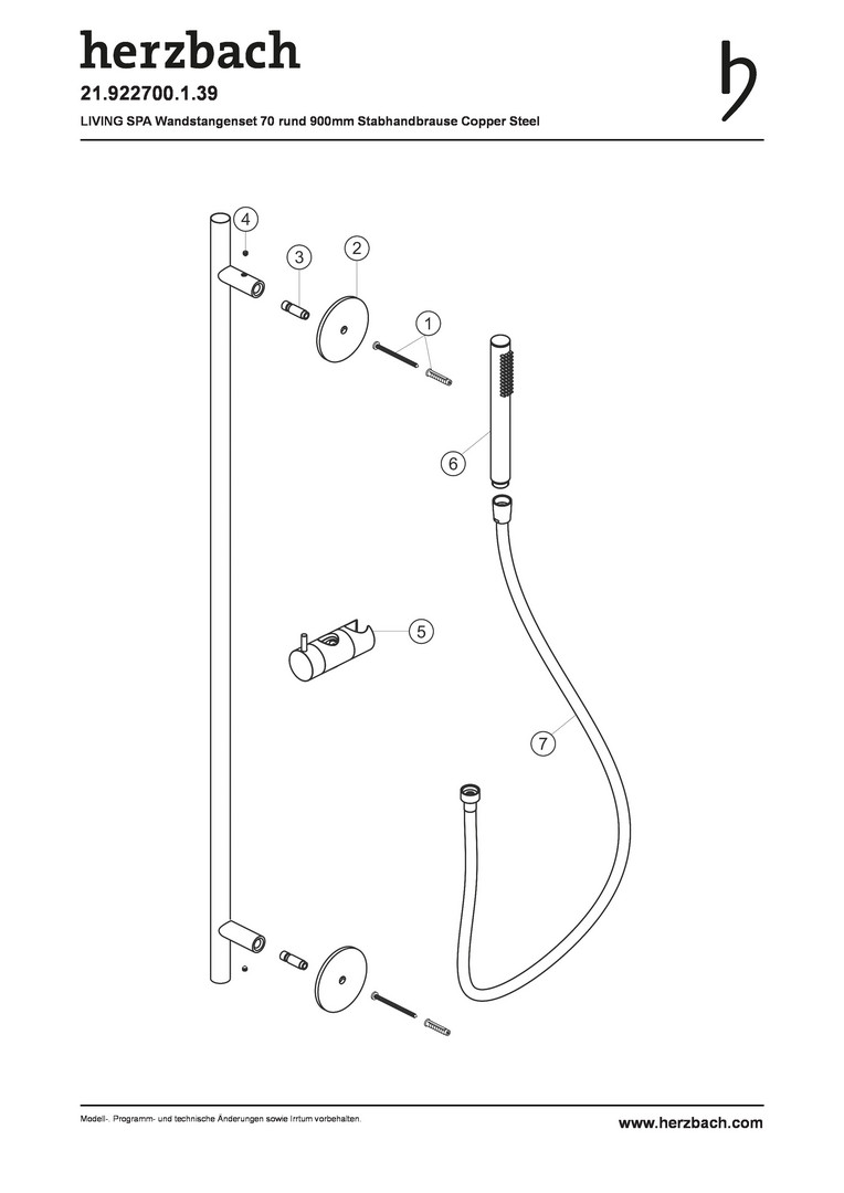 Herzbach Brausegarnitur Living Spa seven round 900mm, Stabbrause, Brauseschlauch, brass steel K10747542