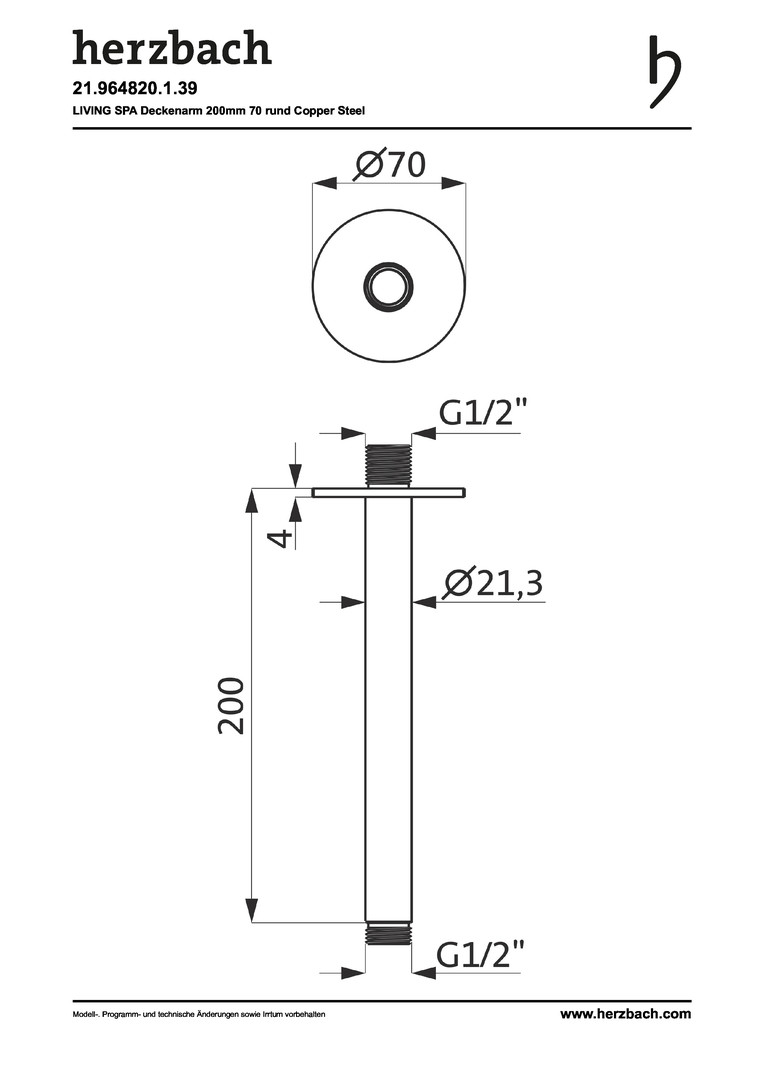 Herzbach Deckenarm Living Spa seven round für Regenbrause, 1/2", 200mm, copper steel