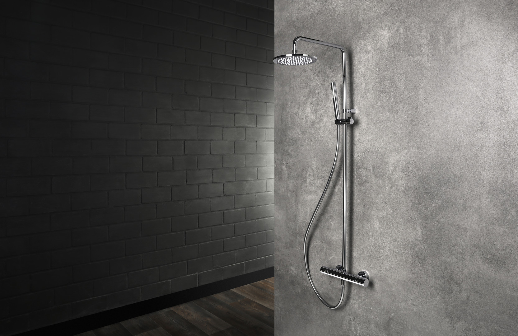 Thermostat mit Ab-/Umstellventil, CoolBody Armaturenkörper, LOGIC-Easyclean Thermostatkartusche, Heißwassersperre bei 38 °C, Brause-Anschlussgewinde 1/2", Regenbrause round, CLEAN EFFECT, Gesamthöhe 1201mm, Brauserohr nicht kürzbar, Brausearm 350 mm (nicht schwenkbar), Konusgleiter höhenverstellbar, mit Brauseschlauch 1500 mm, mit Stabhandbrause Kunststoff