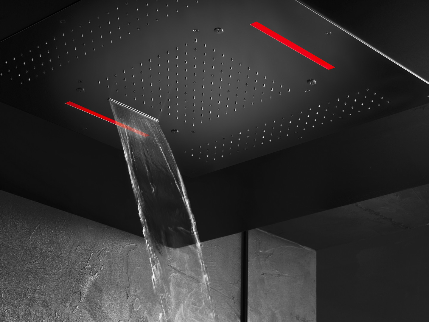 mit integrierter LED-Beleuchtung, Transformator Spannungsversorgung 12 V (CE-zertifiziert), CLEAN EFFECT, 4 Spraydüsen, Funk-Fernbedienung weiß, frei positionierbar, Einbaurahmen für Decke-Unterputz-Installation, Strahlarten Regen/Spray/Schwall, Durchflussmengen (bei 3 bar) Regenstrahl innen ca. 13 l/min, Regenstrahl außen ca. 23 l/min, Spray ca. 8 l/min, Schwall ca. 17 l/min, die Ansteuerung der 4 Strahlarten muss über 4 Ventile erfolgen