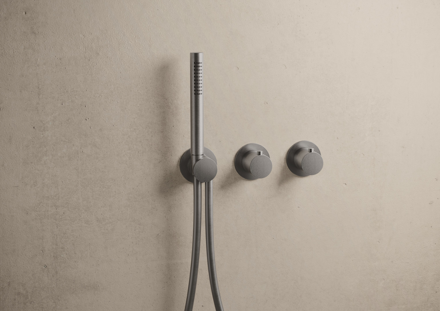 LOGIC-Thermostatkartusche, Heißwassersperre 38°C, stufenlose Mengenregulierung, MODUL7 Brauseschlauch 150 cm mit Drehkonus, eigensicher gegen Rückfließen, bestehend aus Thermostat, Mengenventil, Brausehalterset, Ausführung chrom/PVD Gold/schwarz matt mit Messing Stabhandbrause, Messing Bediengriffen und Messing Modulblenden Ø 70 mm, Ausführung Edelstahl und Edelstahl PVD mit Edelstahl Stabhandbrause, Edelstahl Bediengriffen und Edelstahl Modulblenden Ø 70 mm