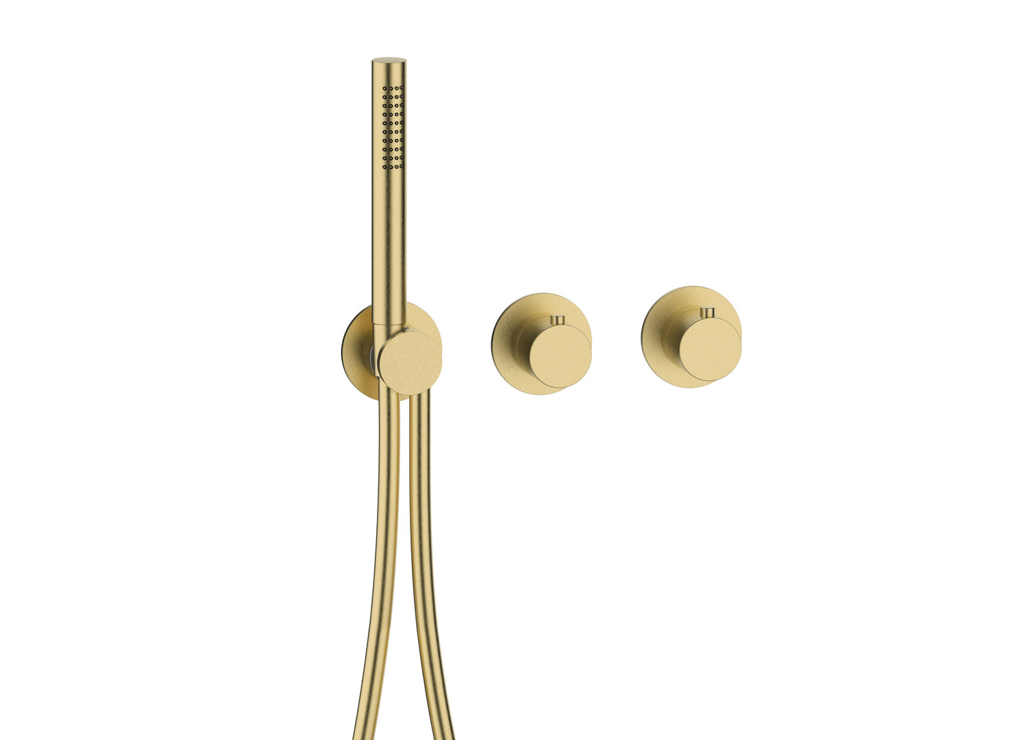 LOGIC-Thermostatkartusche, Heißwassersperre 38°C, stufenlose Mengenregulierung, MODUL7 Brauseschlauch 150 cm mit Drehkonus, eigensicher gegen Rückfließen, bestehend aus Thermostat, Mengenventil, Brausehalterset, Ausführung chrom/PVD Gold/schwarz matt mit Messing Stabhandbrause, Messing Bediengriffen und Messing Modulblenden Ø 70 mm, Ausführung Edelstahl und Edelstahl PVD mit Edelstahl Stabhandbrause, Edelstahl Bediengriffen und Edelstahl Modulblenden Ø 70 mm