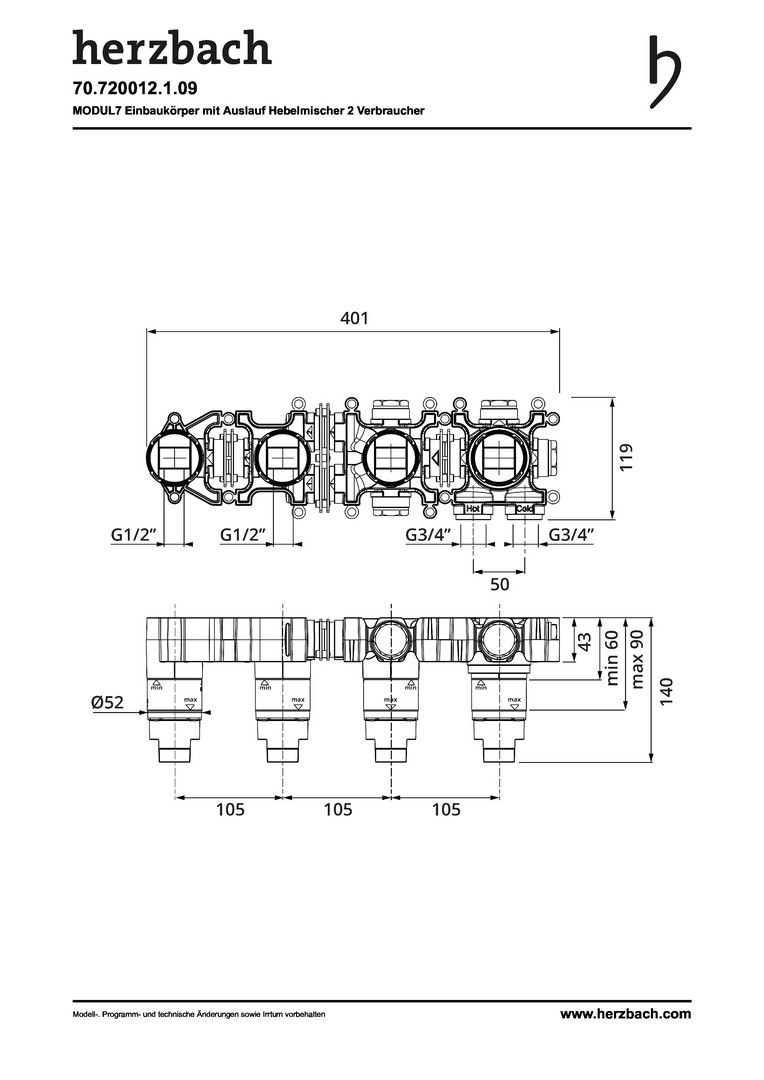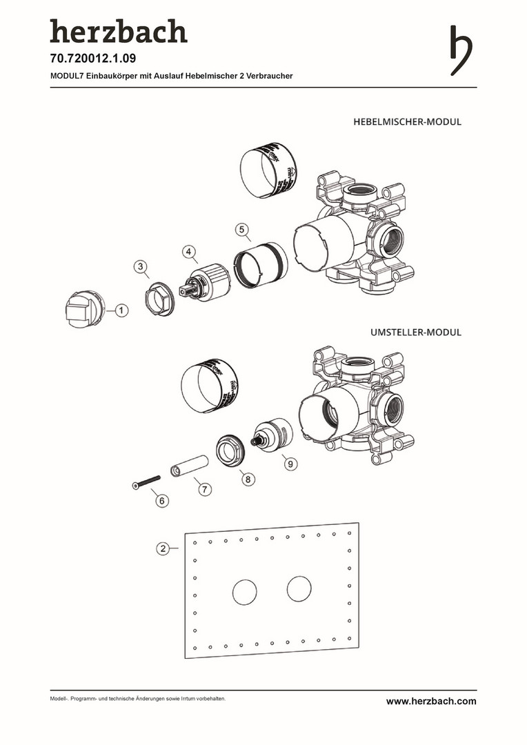 Herzbach Hebelmischer-Einbaukörper MODUL7 mit Auslauf, Einbautiefe 6cm - 9cm, für 2 Verbraucher