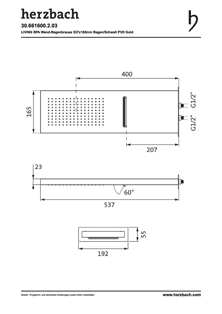 Herzbach Regenbrause Living Spa Multifunktion 2 537x165mm, Wandmontage, 2-strahlig, PVD-gold