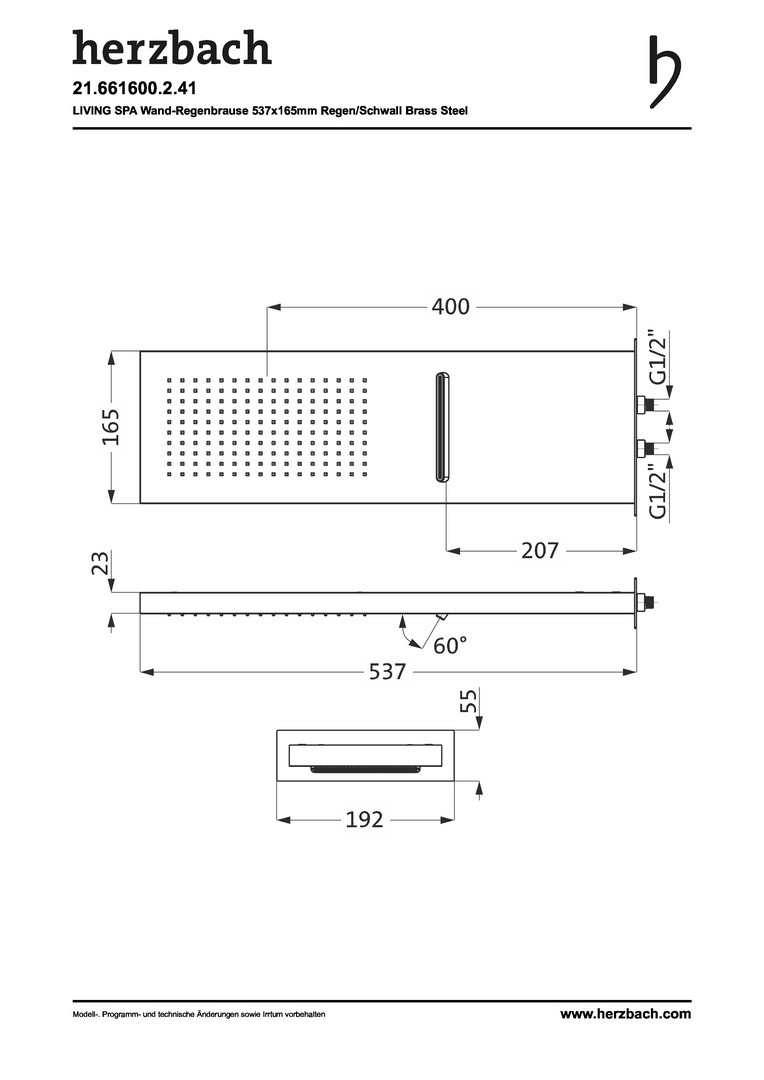 Herzbach Regenbrause Living Spa Multifunktion 2 537x165mm, Wandmontage, 2-strahlig, brass steel