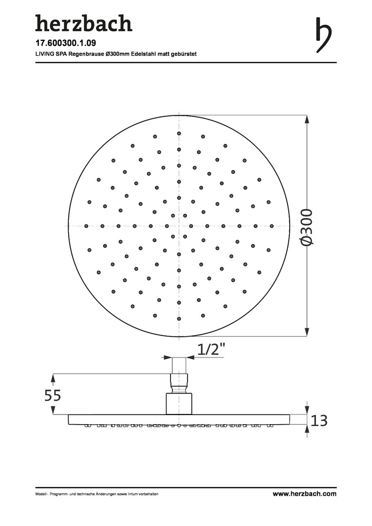 Herzbach Regenbrause Living Spa round für Decken-/ Wandarm, Edelstahl gebürstet, Ø 300 mm