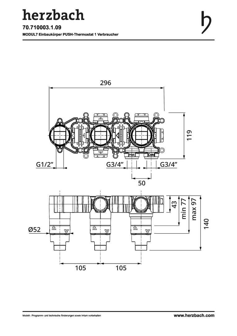 Herzbach Thermostat-Einbaukörper MODUL7 PUSH Einbautiefe 7,7cm - 9,7cm, für 1 Verbraucher