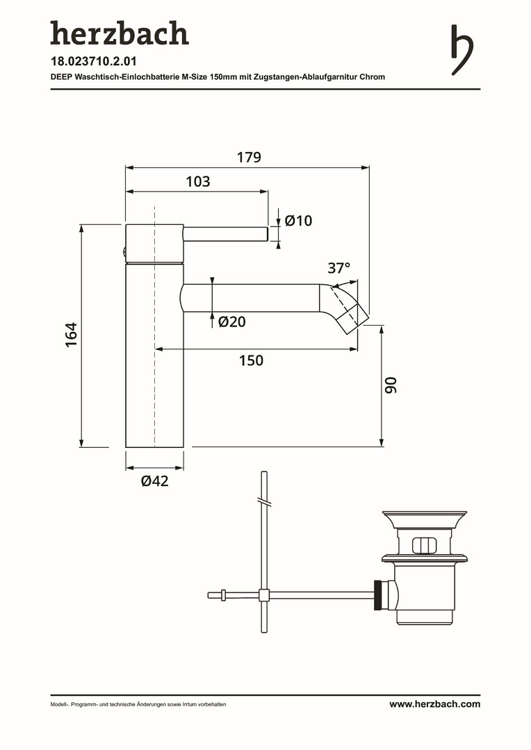 Herzbach Waschtisch-Einhebelmischer Deep M-Size, mit Zugstangen-Ablaufgarnitur, Auslauf 150 mm, chrom
