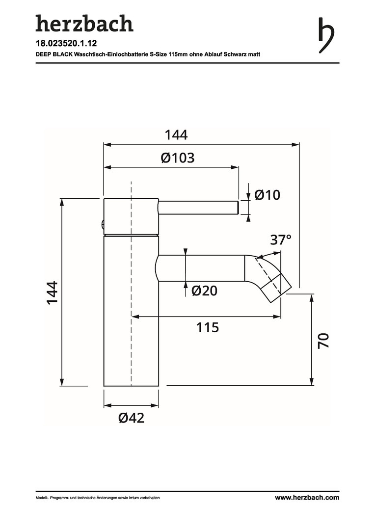 Herzbach Waschtisch-Einhebelmischer Deep S-Size, 115mm, ohne Ablaufgarnitur, Schwarz matt